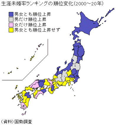 東日本に男性未婚者が多く、大都市や西日本に女性未婚者が多い
